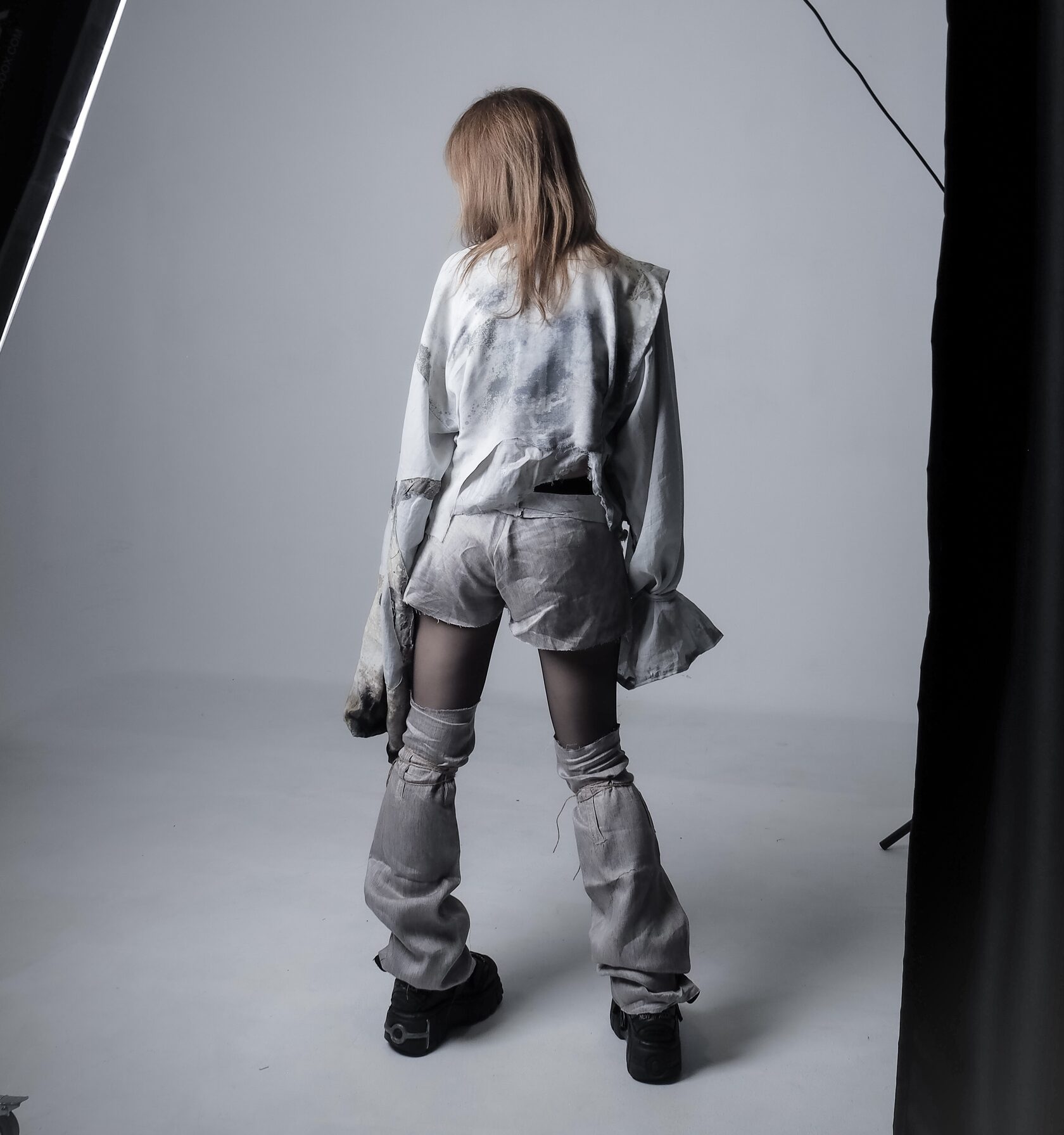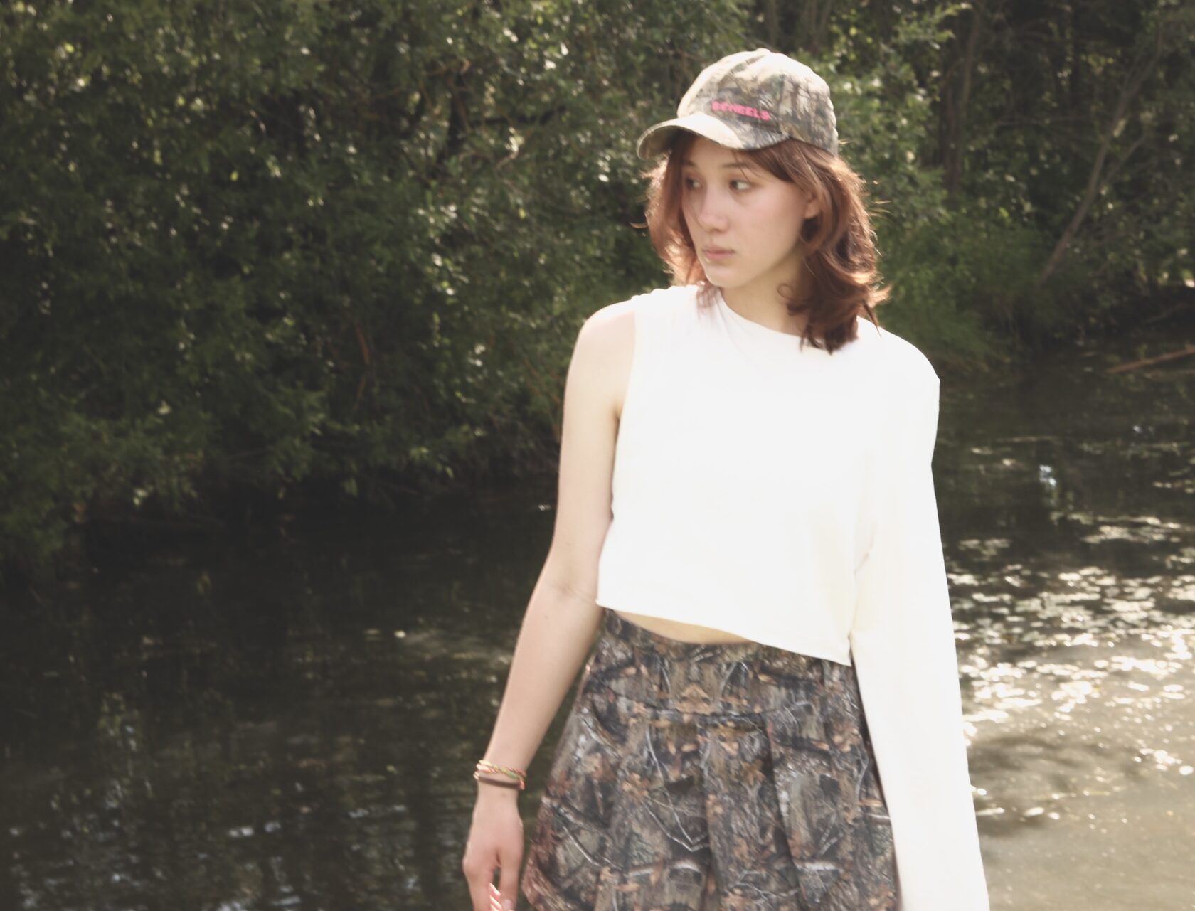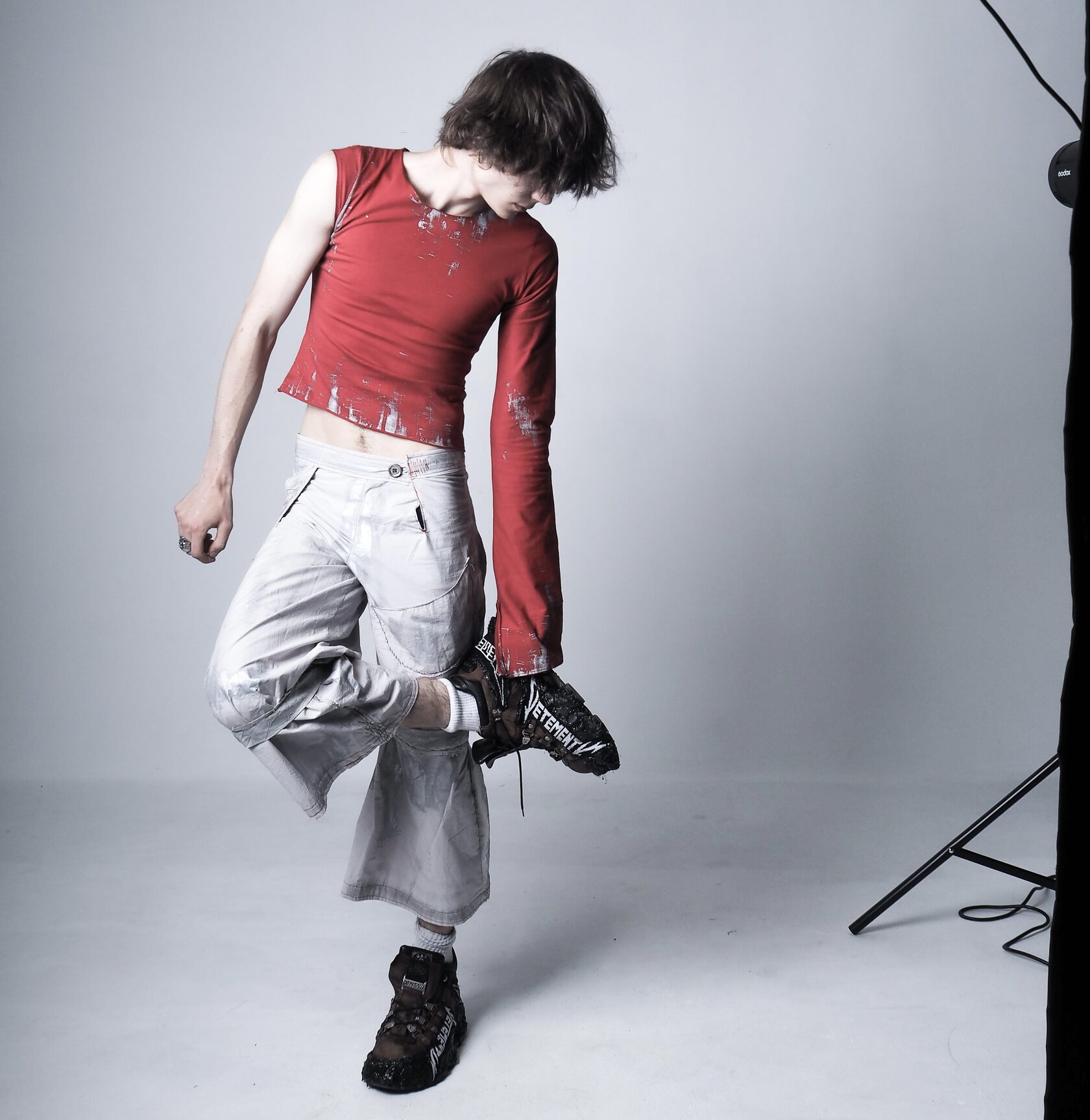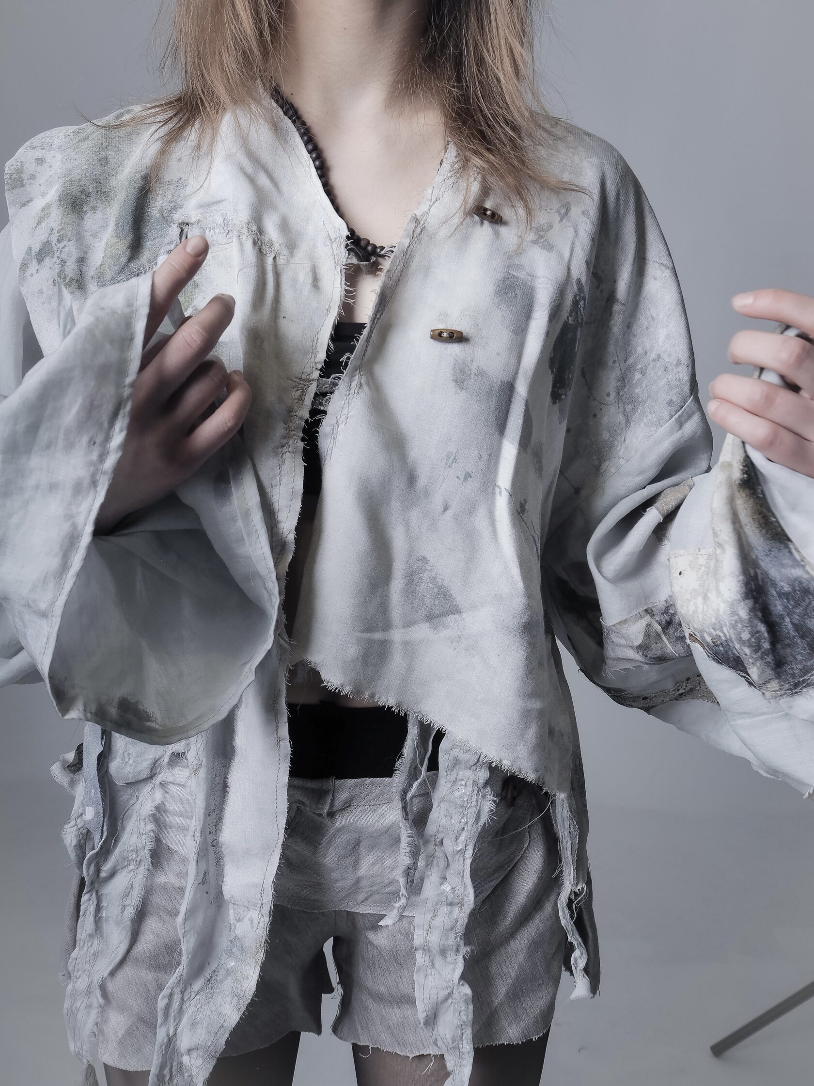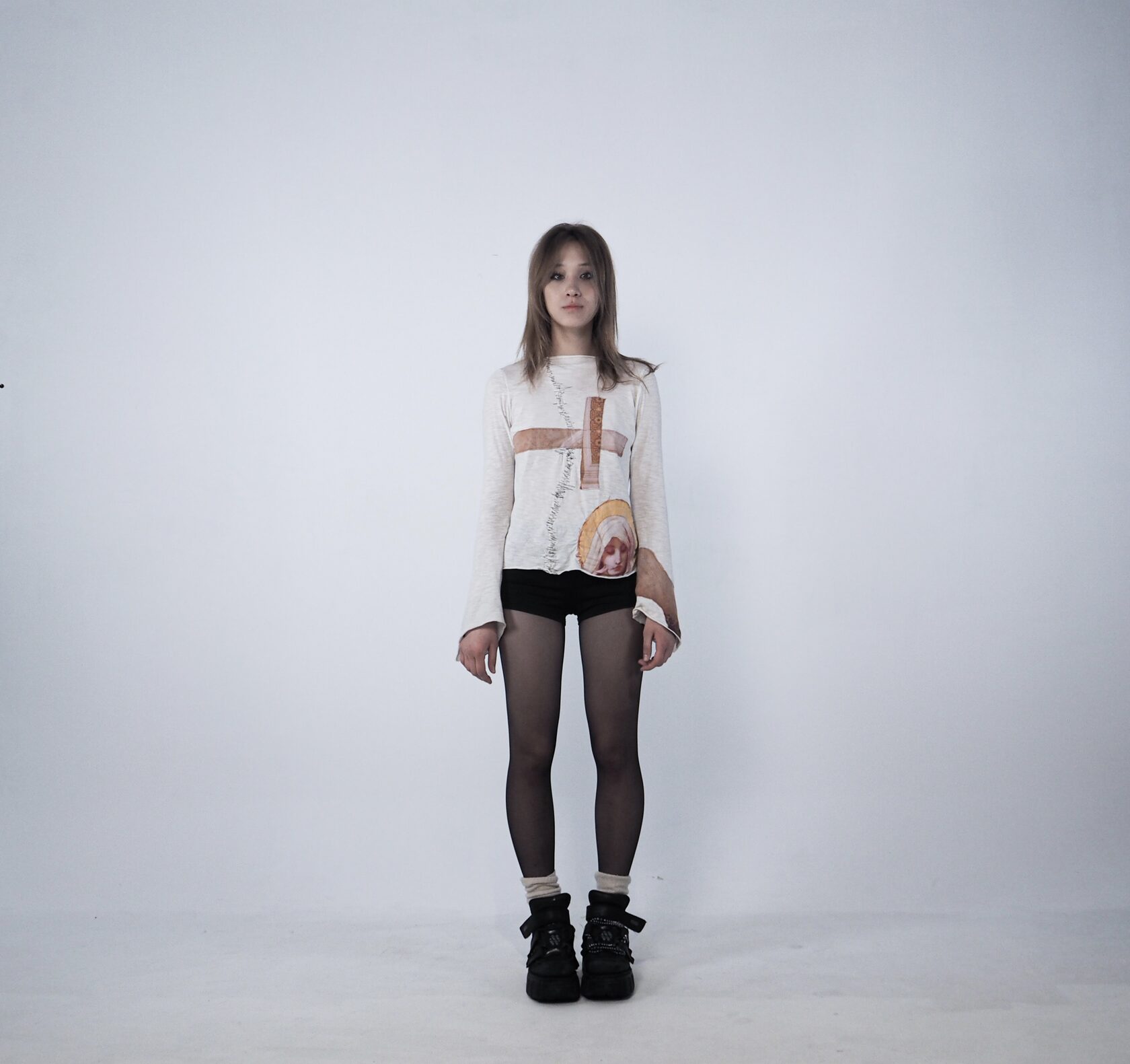 Коллекция одежды «детствовать» вдохновлена моими воспоминаниями о детстве, пропитана вымыслом и «изощренной» реальностью. Кукольные гетры, испачканный лонгслив с оборванным рукавом, новогоднее платье феи и даже принт дачной охотничьей куртки — все это нашло воплощение в моих изделиях