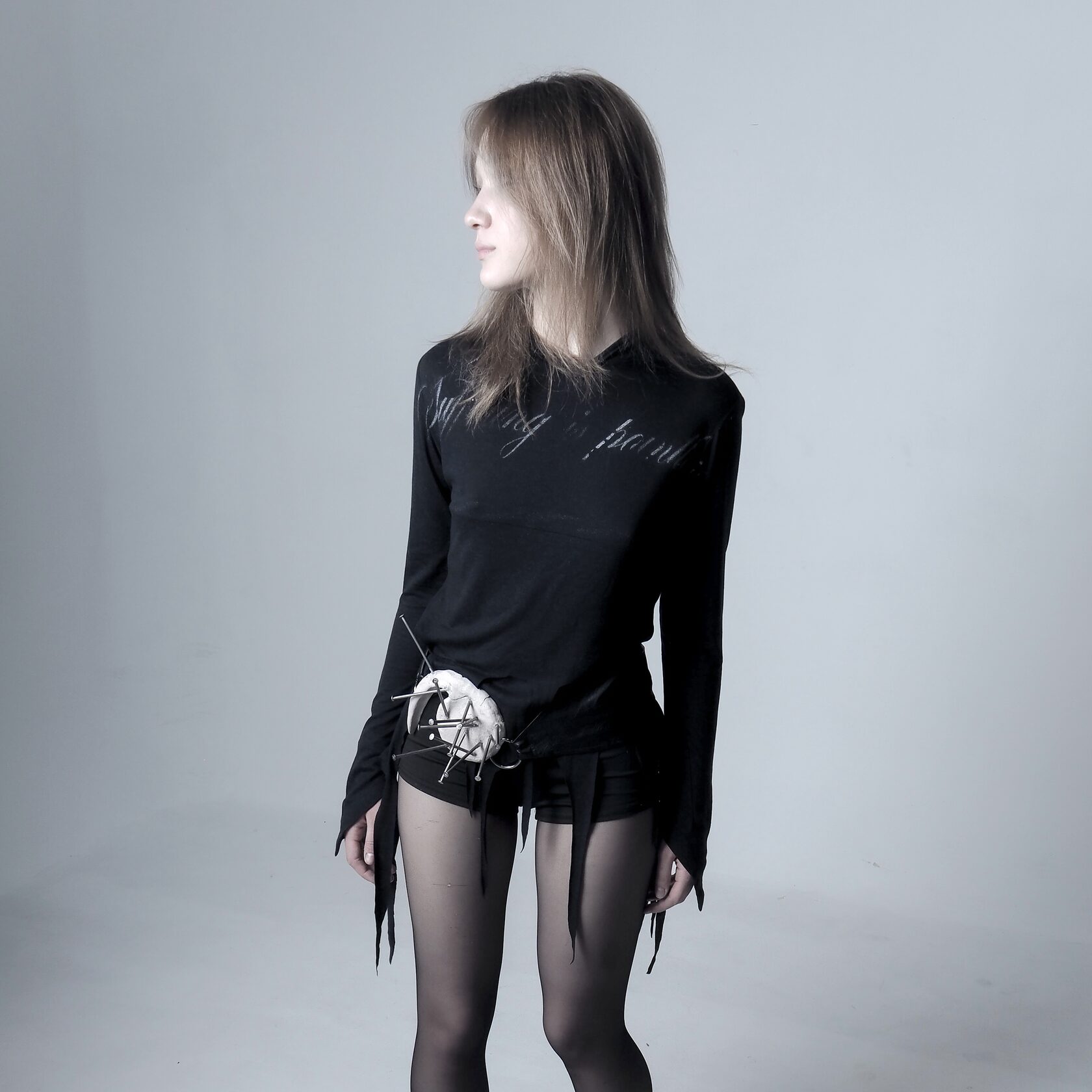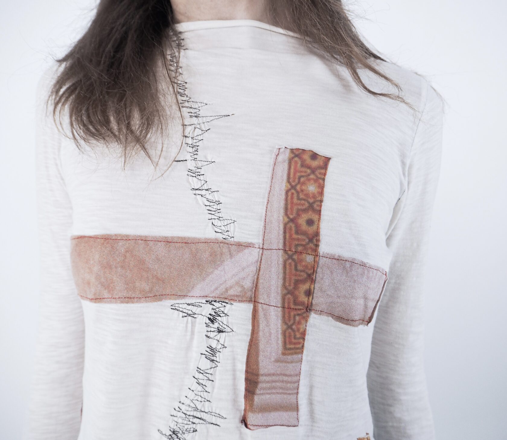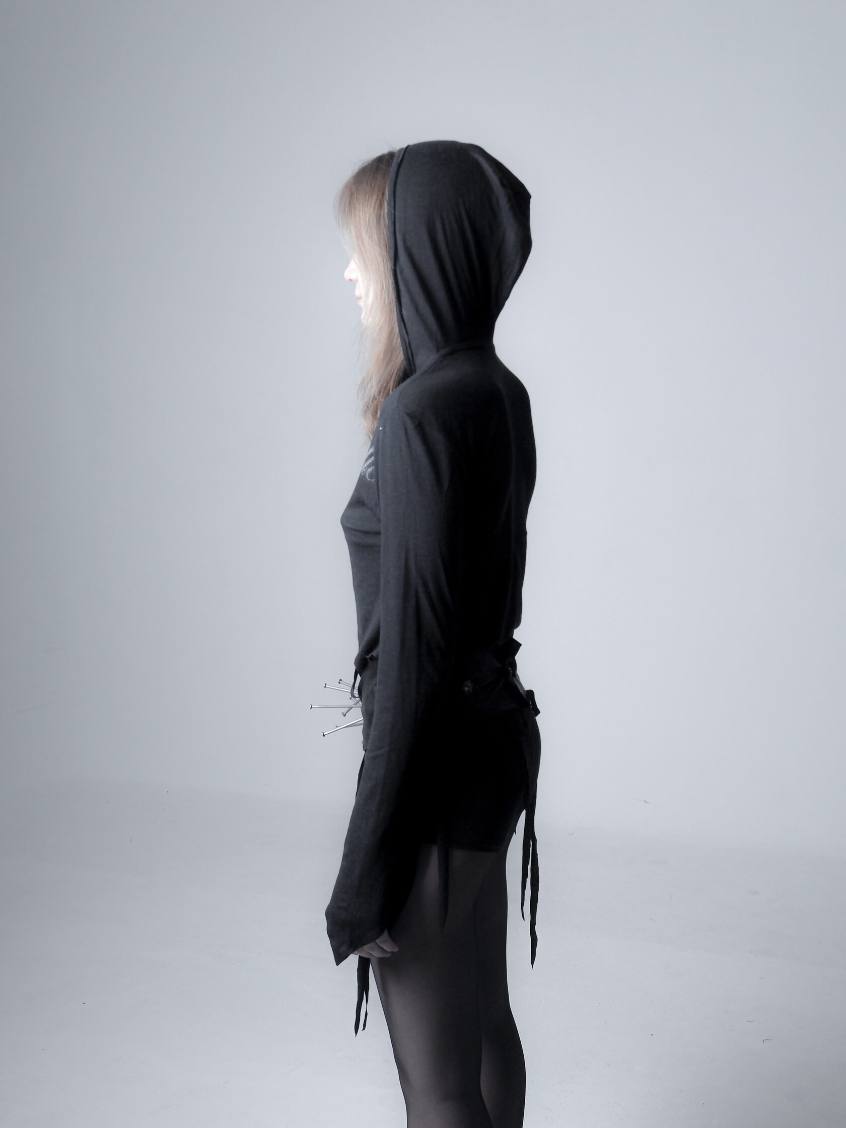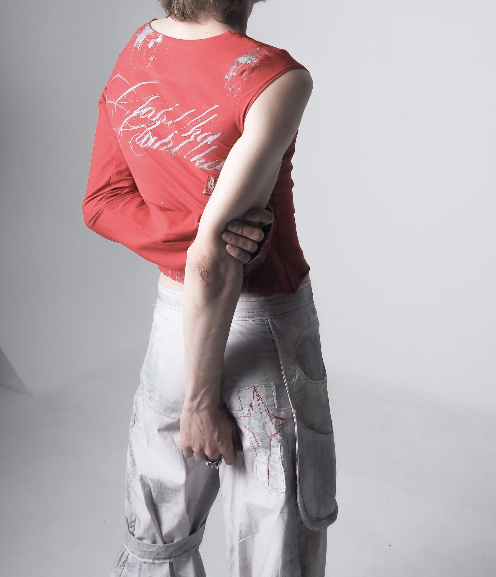 Коллекция одежды «детствовать» вдохновлена моими воспоминаниями о детстве, пропитана вымыслом и «изощренной» реальностью. Кукольные гетры, испачканный лонгслив с оборванным рукавом, новогоднее платье феи и даже принт дачной охотничьей куртки — все это нашло воплощение в моих изделиях